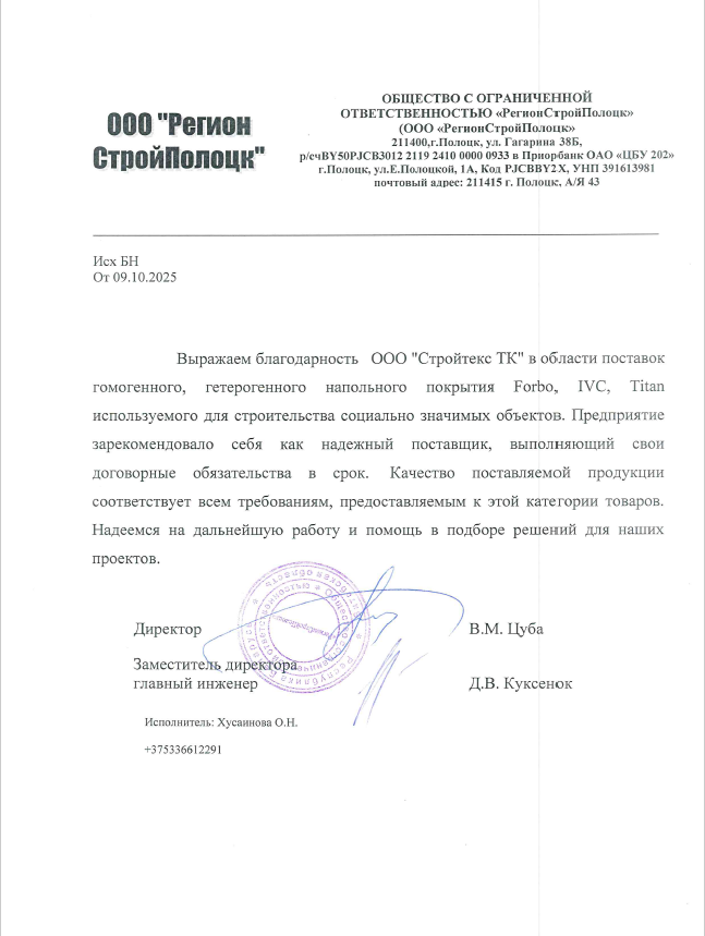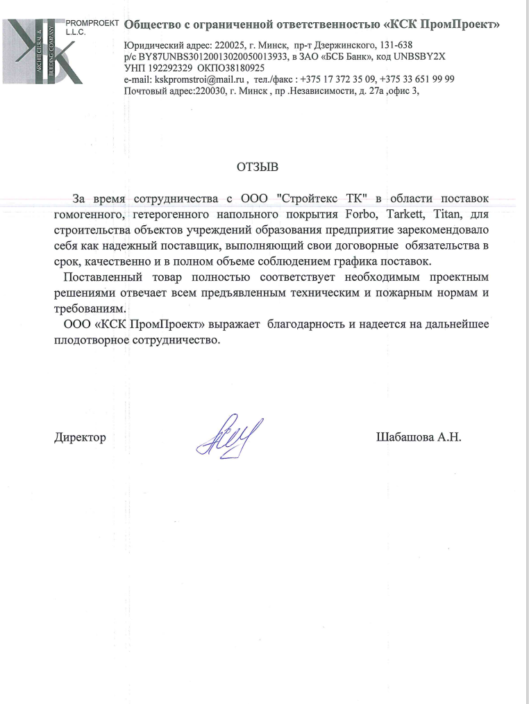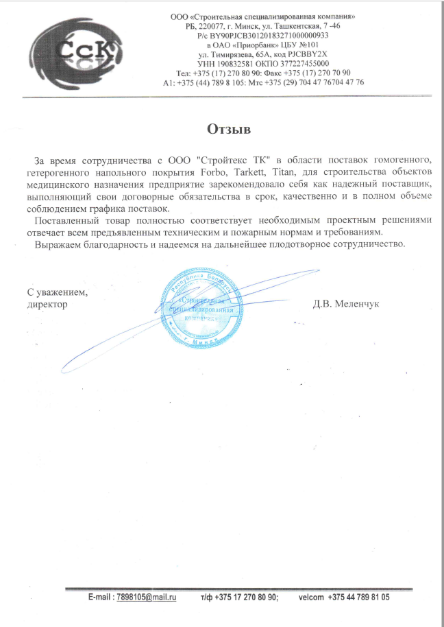 За время сотрудничества с ООО "Стройтекс ТК" в области поставок гомогенного, гетерогенного напольного покрытия Forbo, Tarkett, Titan, для строительства объектов медицинского назначения предприятие зарекомендовало себя как надежный поставщик, выполняющий свои договорные обязательства в срок, качественно и в полном объеме с соблюдением графика поставок.